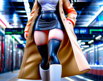 AI画像・CG画像 【フィギュア風】疲れた大学生の帰宅途中2 ~市営地下鉄の階段を上る彼女~ 白T×トレンチ×黒レザースカート×白ブーツ黒ニーソ
