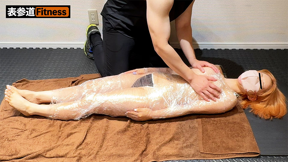 ラッピングを終えると、梓さんを抱きかかえ仰向けにします。そして全身のマッサージを行い温めていきます。「もう外してください」「何してるんですか」「やめてください」と梓さんはマッサージしている間ずっと抵抗していますが、ラッピングをしているので、自分から逃げ出すことはできない状態です。