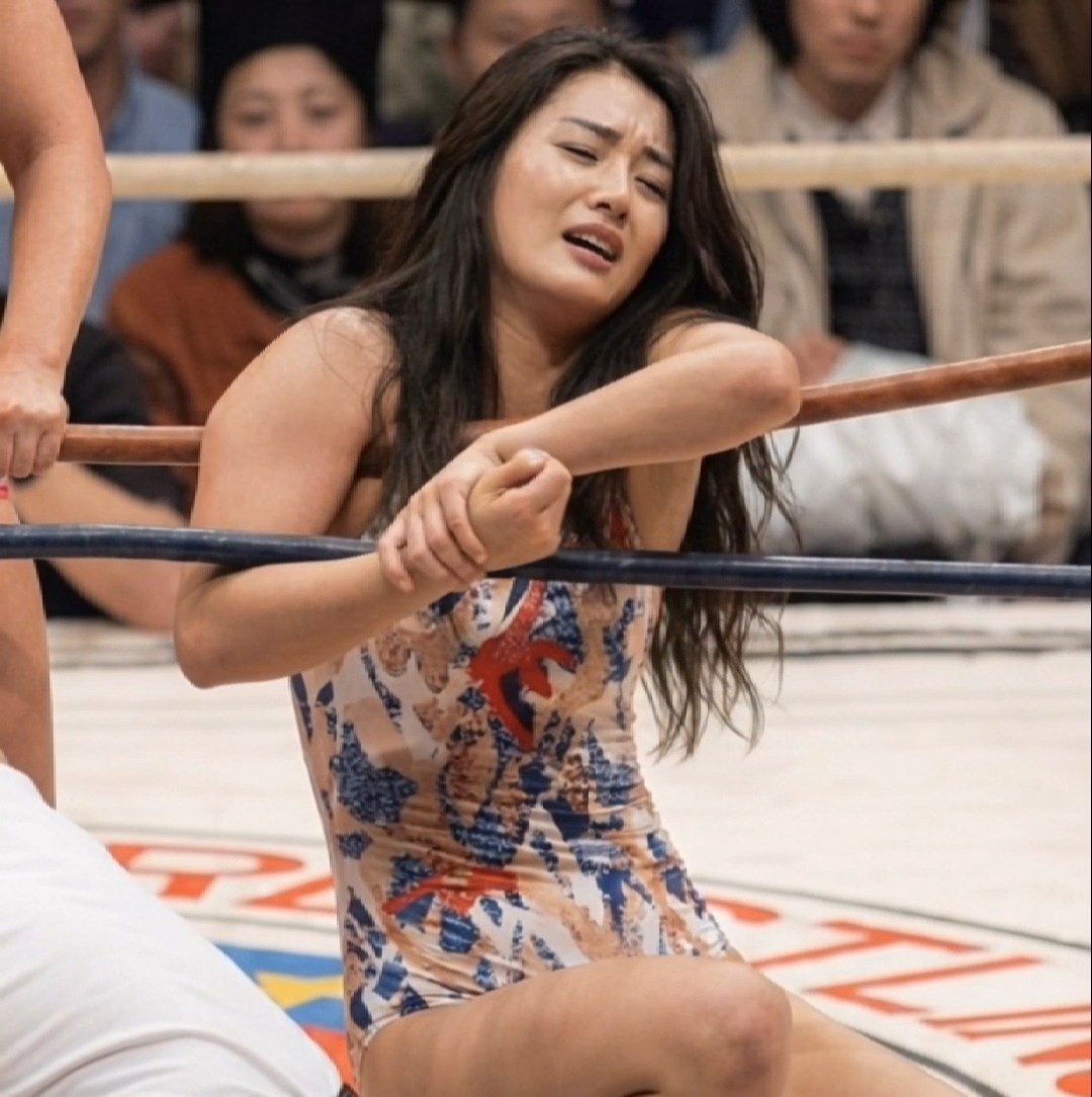 美しきアスリートが、腕への集中的な攻撃を受け、苦悶の表情を浮かべる。ロングヘアーをなびかせ、モデルのような佇まいを持つ女子プロレスラー。
