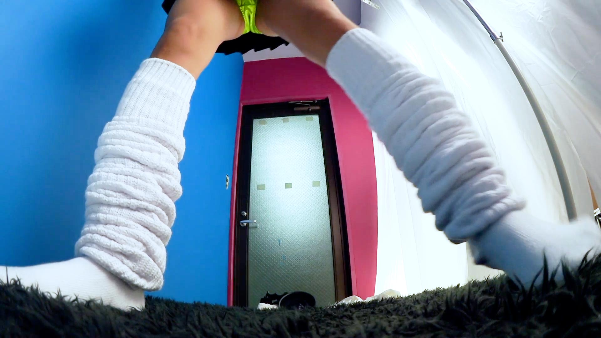 立ち上がりラックからルーズソックスを掴み、床に座って片脚に長いルーズソックスを被せます。スベ肌の腿の合間にモッコリ盛り上がるパンティラインを捉えます。更にもう片方の脚にルーズソックスを通します。横向きモッコリ、パンティラインが見えます。