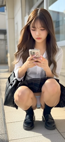 ■脚が疲れたのか、しゃがんでパンチラしながらスマホをいじるシーン