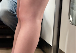 脚が開きシミパンを逆さアップで捉えます。机の上にスベ肌の両腿を開き、愛液が滲んだパンティラインを見せます。立ち上がり逆さ撮りでムッチリ股間を映します。滲むパンティラインをアップで映し、その場に屈み座り更にアップで腿についた愛液を映します。