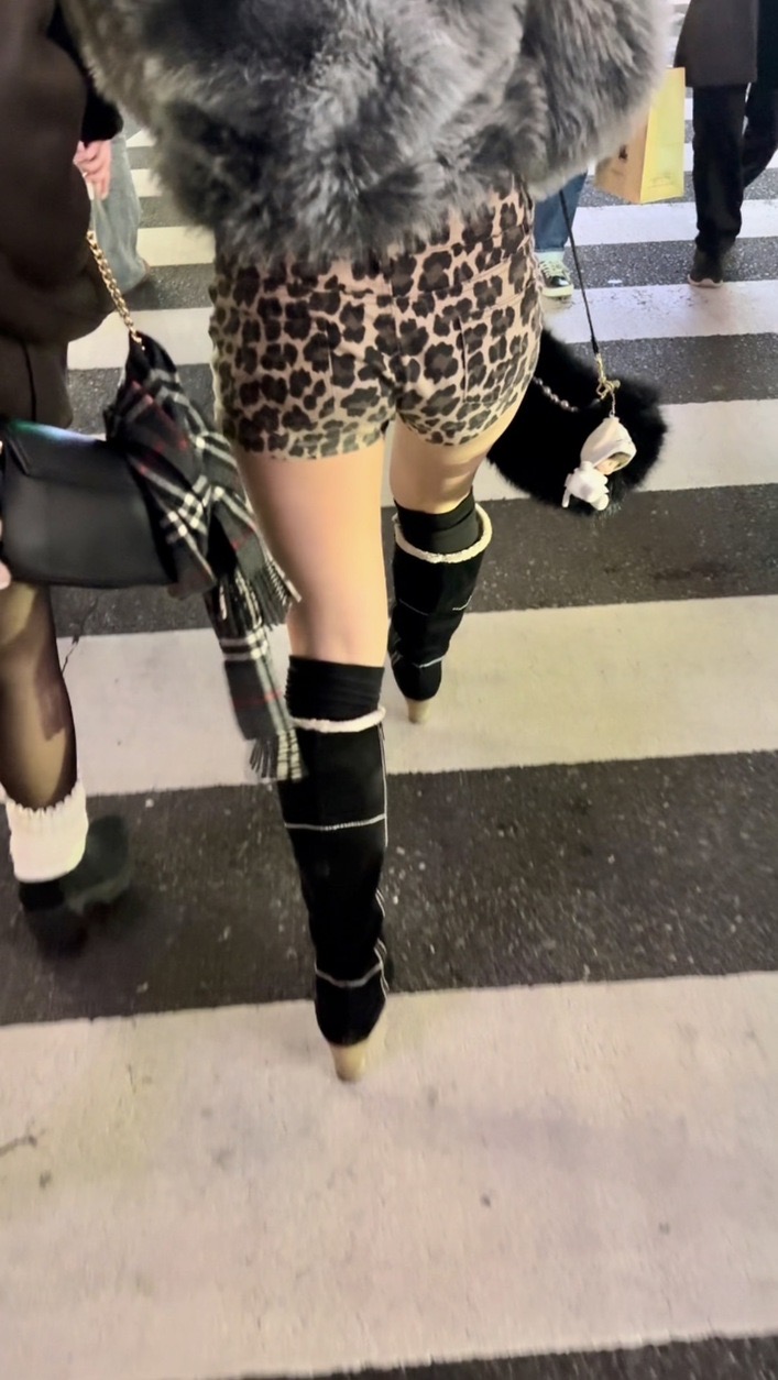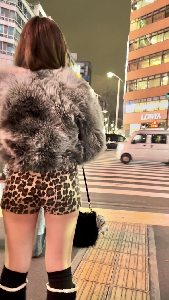 1人目(表題)はもこもこのアウターにヒョウ柄のショートパンツの女子大生