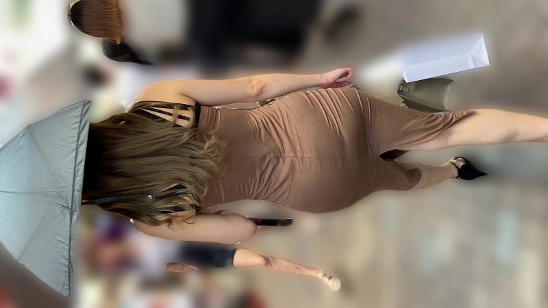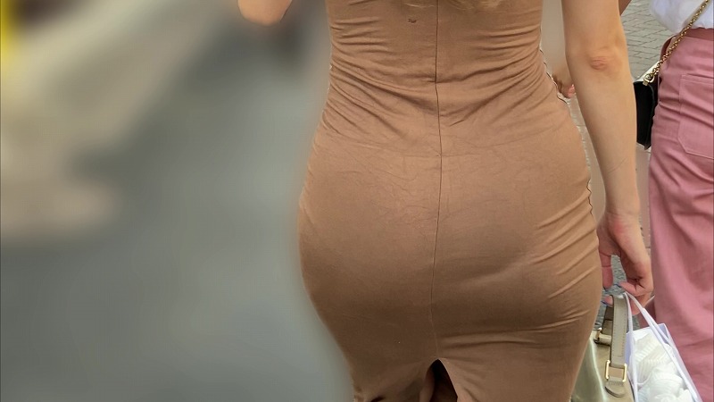 街をゆったりと歩く、体のラインがくっきりと浮かび上がる茶色いボディコンを着た茶髪ギャルを撮影させていただきました。