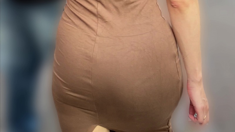 後ろ姿での歩行シーンのみを収録。ゆっくりとした足取りの中で揺れるヒップラインが、見る者の想像力を刺激します。タイトなボディコンならではの直線的でいて艶っぽいシルエットが、終始セクシーな空気をまとっています。