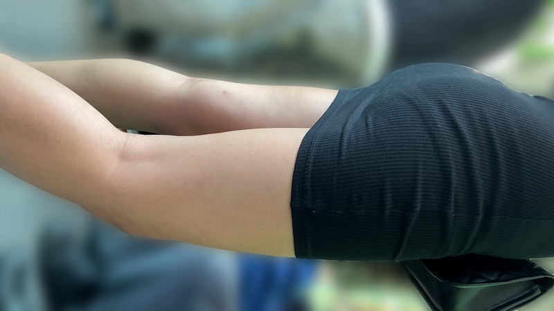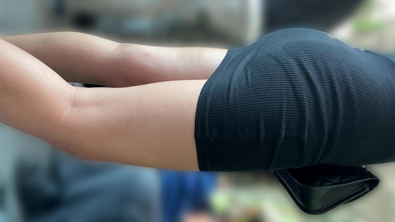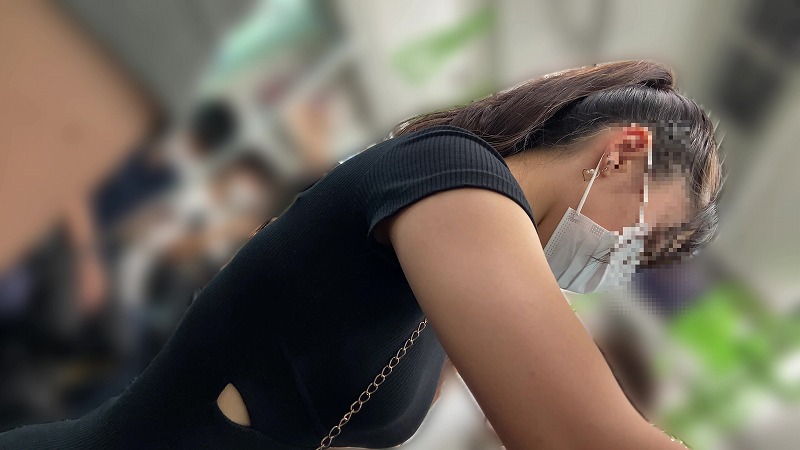 前半は上半身を中心に撮影。フィット感のあるニット生地のため、バストラインやデコルテの立体感が自然と強調され、ギャルらしい華やかな雰囲気が伝わってきます。シンプルなデザインながら、スタイルの良さが際立っていました。