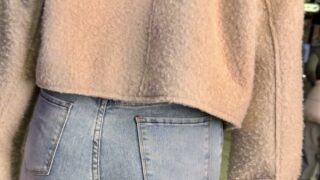 身体にフィットするトップスのため、バストの立体感がしっかりと伝わり、デコルテから胸元にかけてのラインもきれいに映えます。スレンダーな体型とのコントラストで、全体のバランスの良さが際立つスタイルでした。
