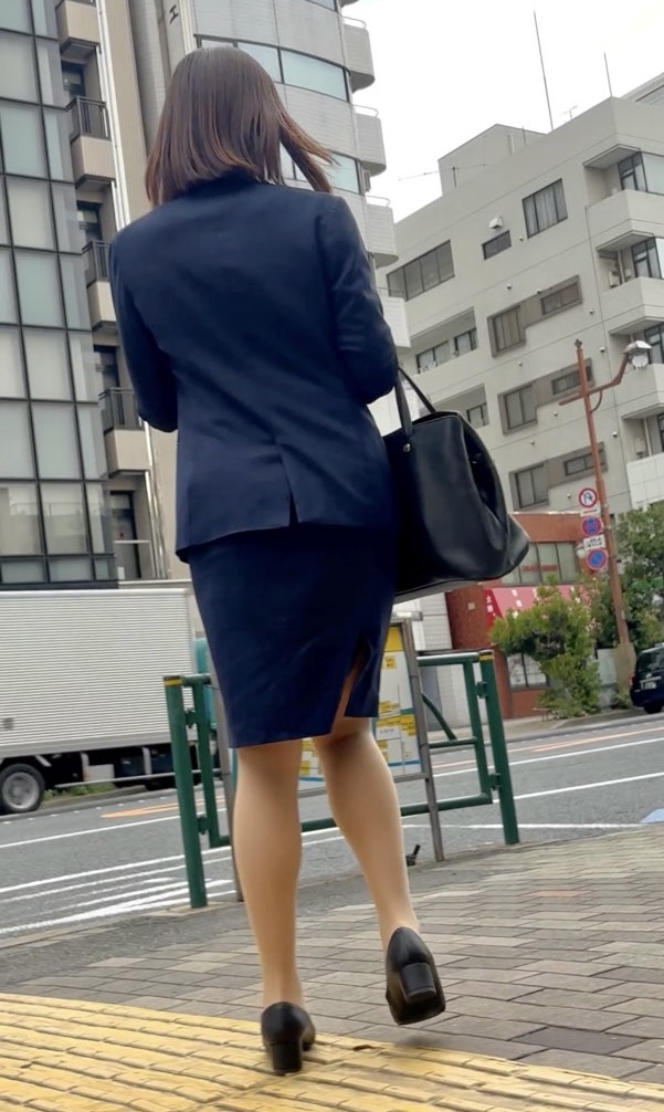 青系の大人スーツOLかつ膝上3センチほどの丈のタイトスカートが絶品かつ、ボリューム感のあるお尻周りが素晴らしいフォルム。そして言わずもがな、たまらない美脚が眩しい…。