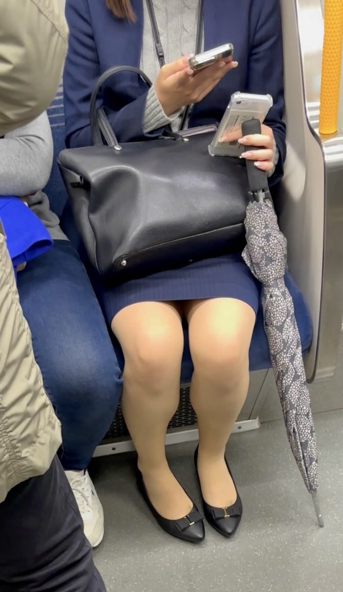 電車内で座っている様子も上からのアングルで長めに収めました。ここでの美脚は素晴らしく、なんともそそる丈のスカートとの組み合わせで絶景となっています。