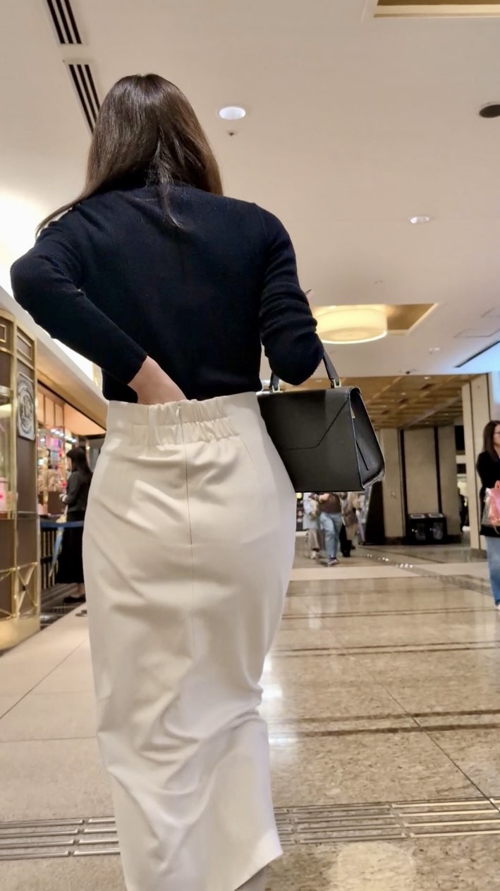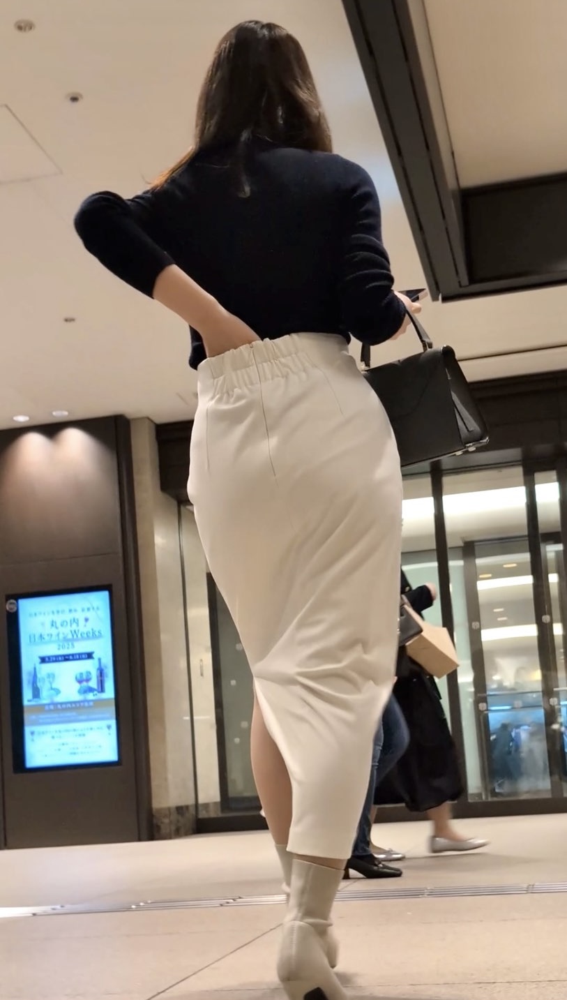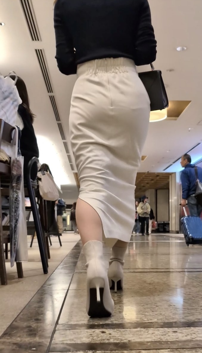 1人目は白のロングタイスカのOLさん。髪もサラサラで高身長スタイルも素晴らしいです!思わず見惚れて追尾してみると、その白スカートの内側のラインが常に透けていることを確認、歩行に合わせてムニムニと妖しげな動きを見せます。