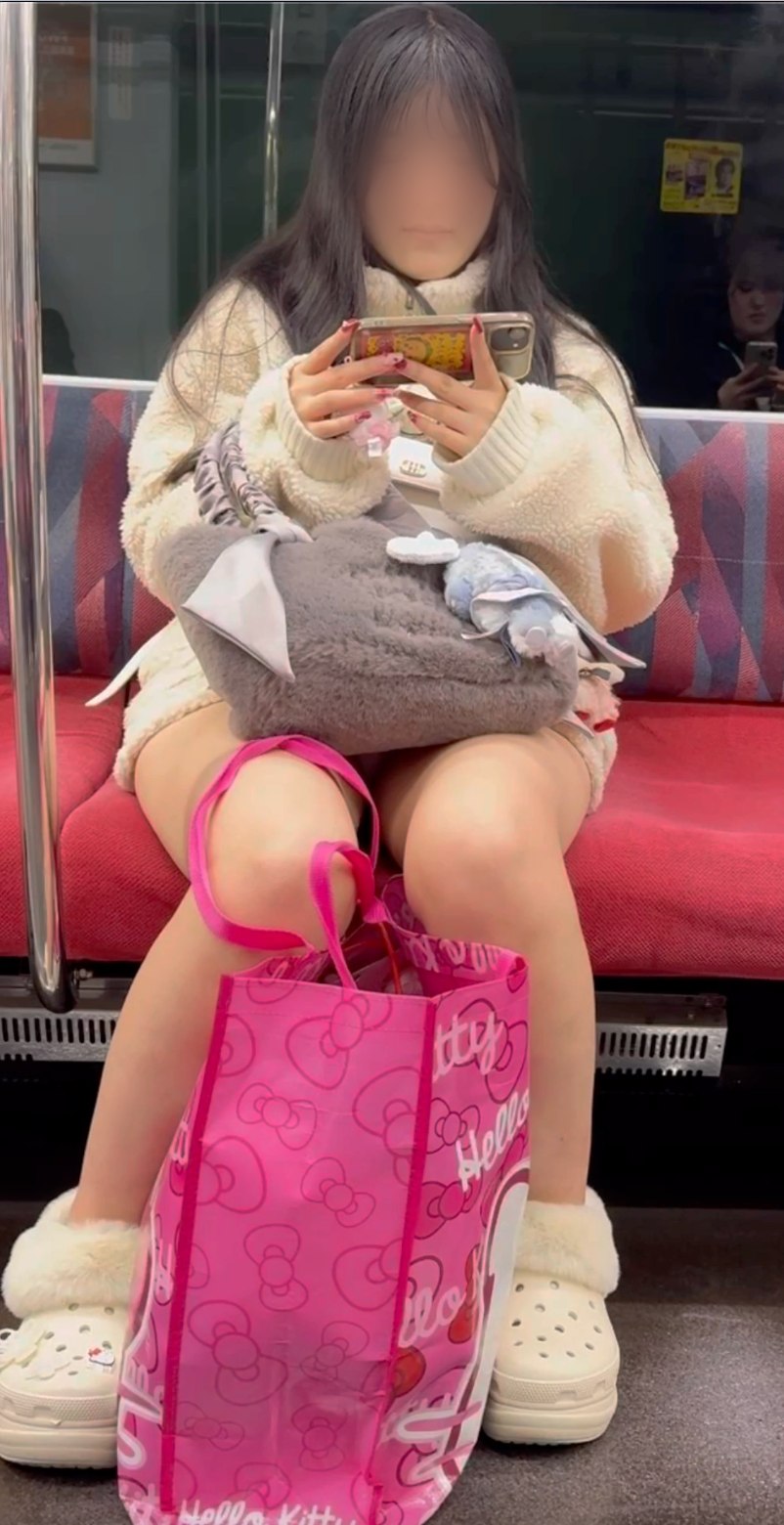 最初は膝の間に大きなバッグを置き、一見ガードを固めているように見えます。しかし、スマホに夢中になるあまり、その警戒心は失われています。