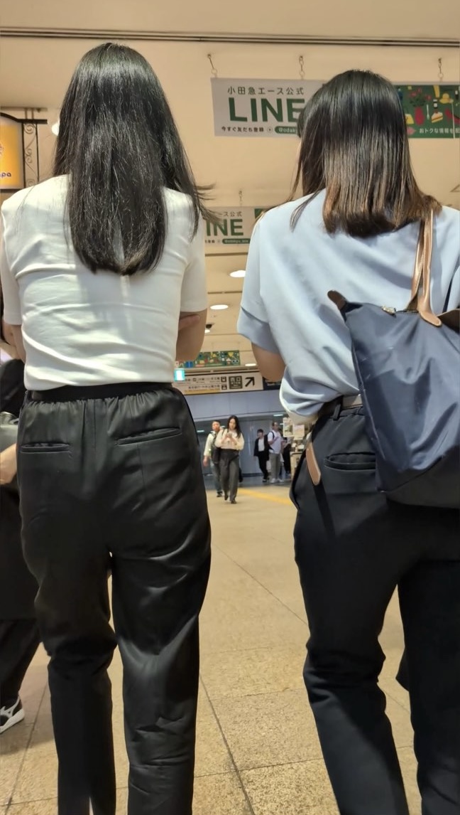とある地下街にて、気になるOLさんコンビに遭遇!タイトめの白いニットが眩しいサラサラロングヘアOLさんと、パンツのボリュームとウエストの締まりが気になるOLさんという組み合わせ。