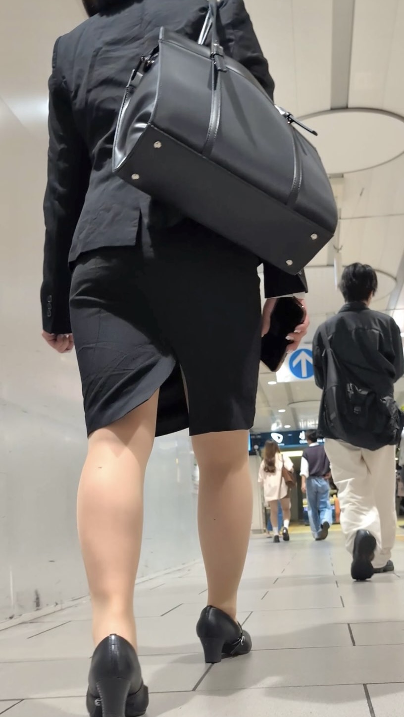 3人目は大型の駅構内を延々と歩くリクルートスーツOLさん。一見控えめなルックながら、意外にも攻めたバックスリットを披露しながら歩いています。長いまっすぐの通路を歩くたびに目が離せません!