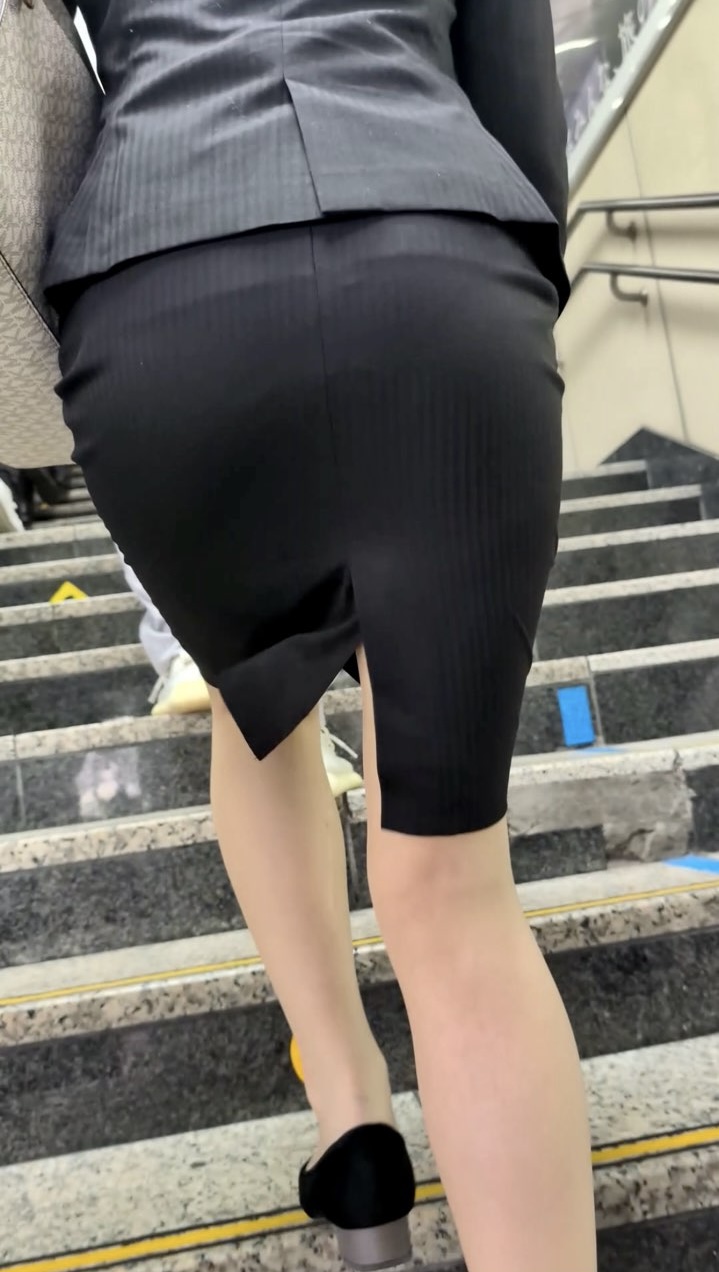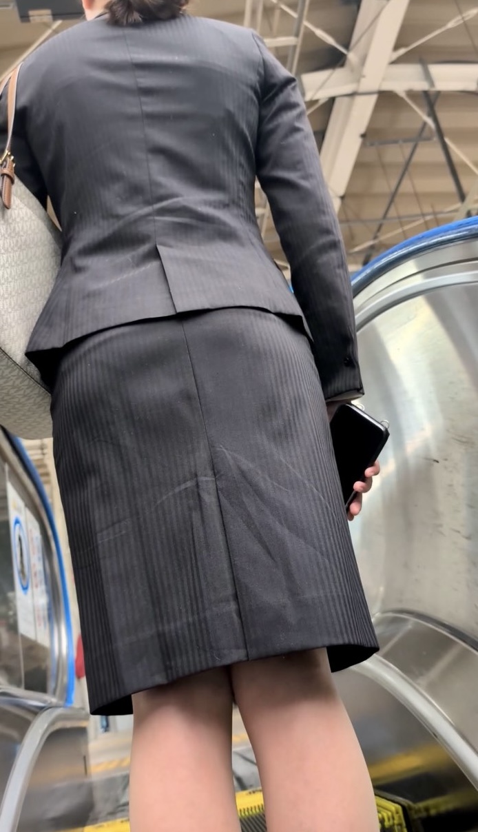 見どころは本当に多いのですが、まずはエスカレーターでのバックショットでのスカートのたまらない裾の具合!そして後半の階段登りは最高です。もとより透けているタイトスカートが、階段のステップを登るたびにぐいぐいと…。素晴らしい光景が繰り広げられます。