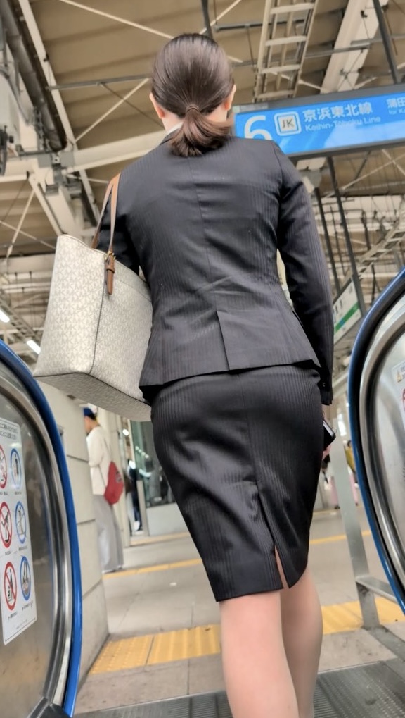 いきなりのエスカレーターバックショットからスタート、ホームでの電車待ちショットにてそのスタイルをじっくり確認!その後電車に乗り込み、到着した駅でのホーム歩行シーンから階段登りへ。