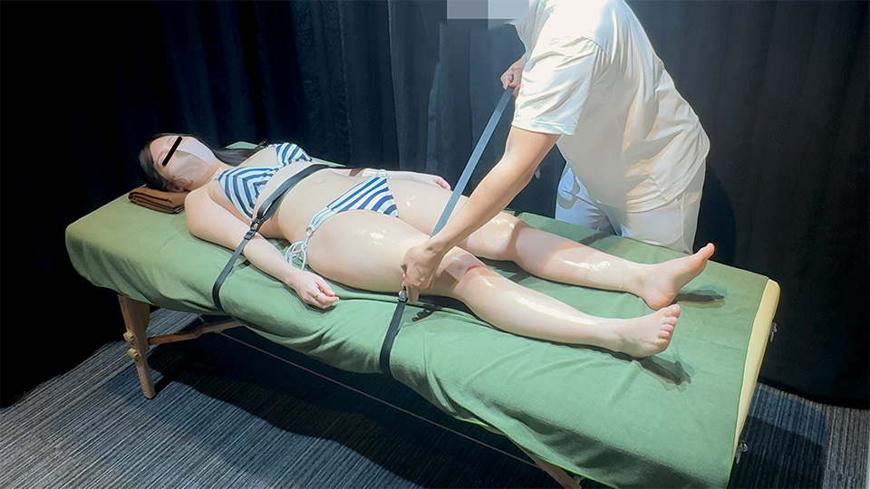 彼女の胸のビキニの紐を静かに解き、胸を揉んだ。彼女は気づき、突然のことに少しパニックになった様子で「え…ちょっと…」と身体を動かそうとするが、ベルトで施術台に固定されている。「外して…」という声を無視して乳首開発のおもちゃを胸に当てた。