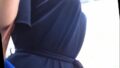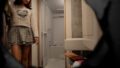 姿鏡の方面に歩いていき、その場に屈み座ります。パカっと開いた腿の合間から黒のレースがついた、パンティラインが見えます。