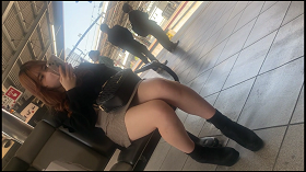 駅のホームのベンチに座っている可愛い女のミニスカ生足を撮影しています。