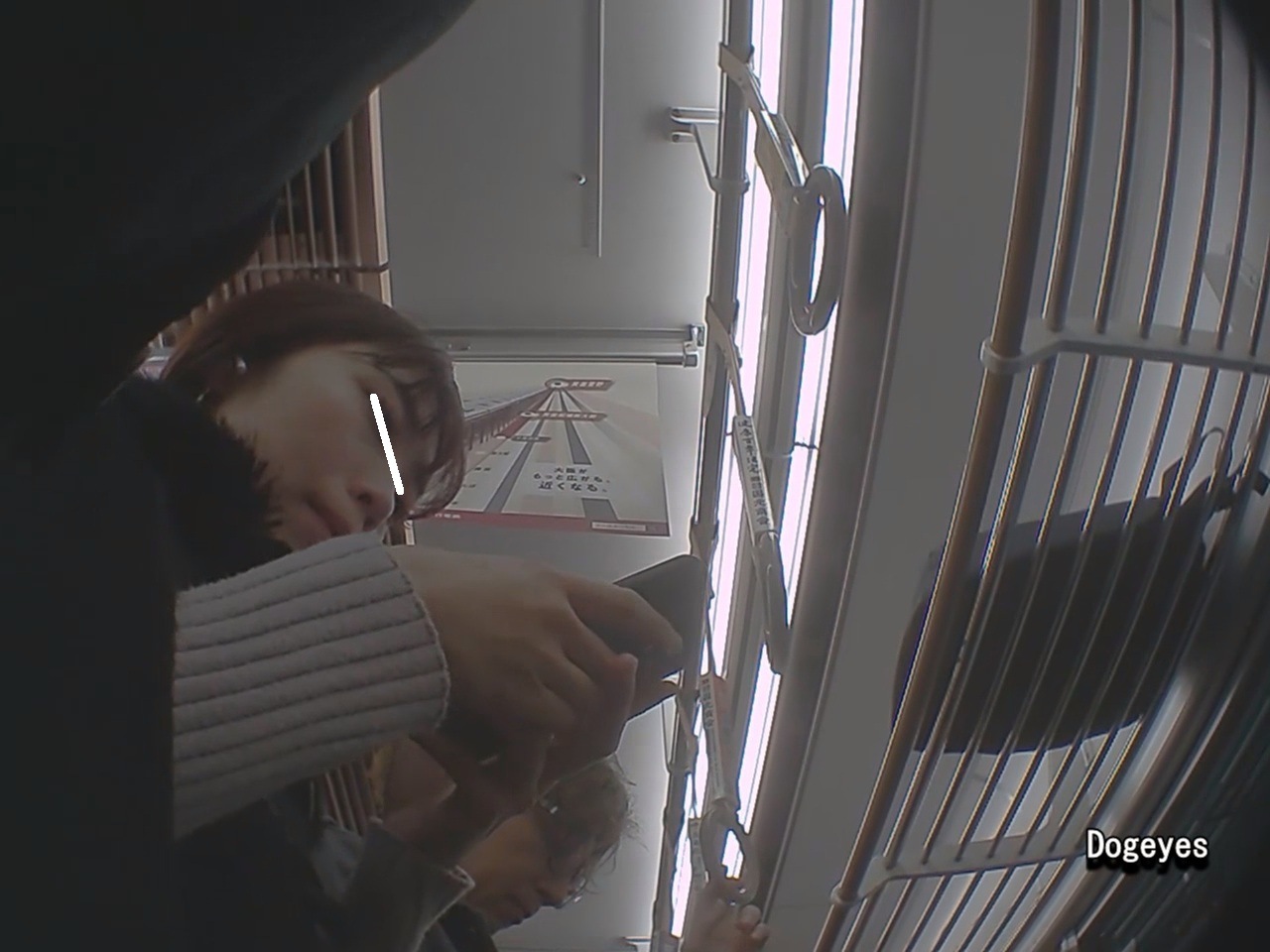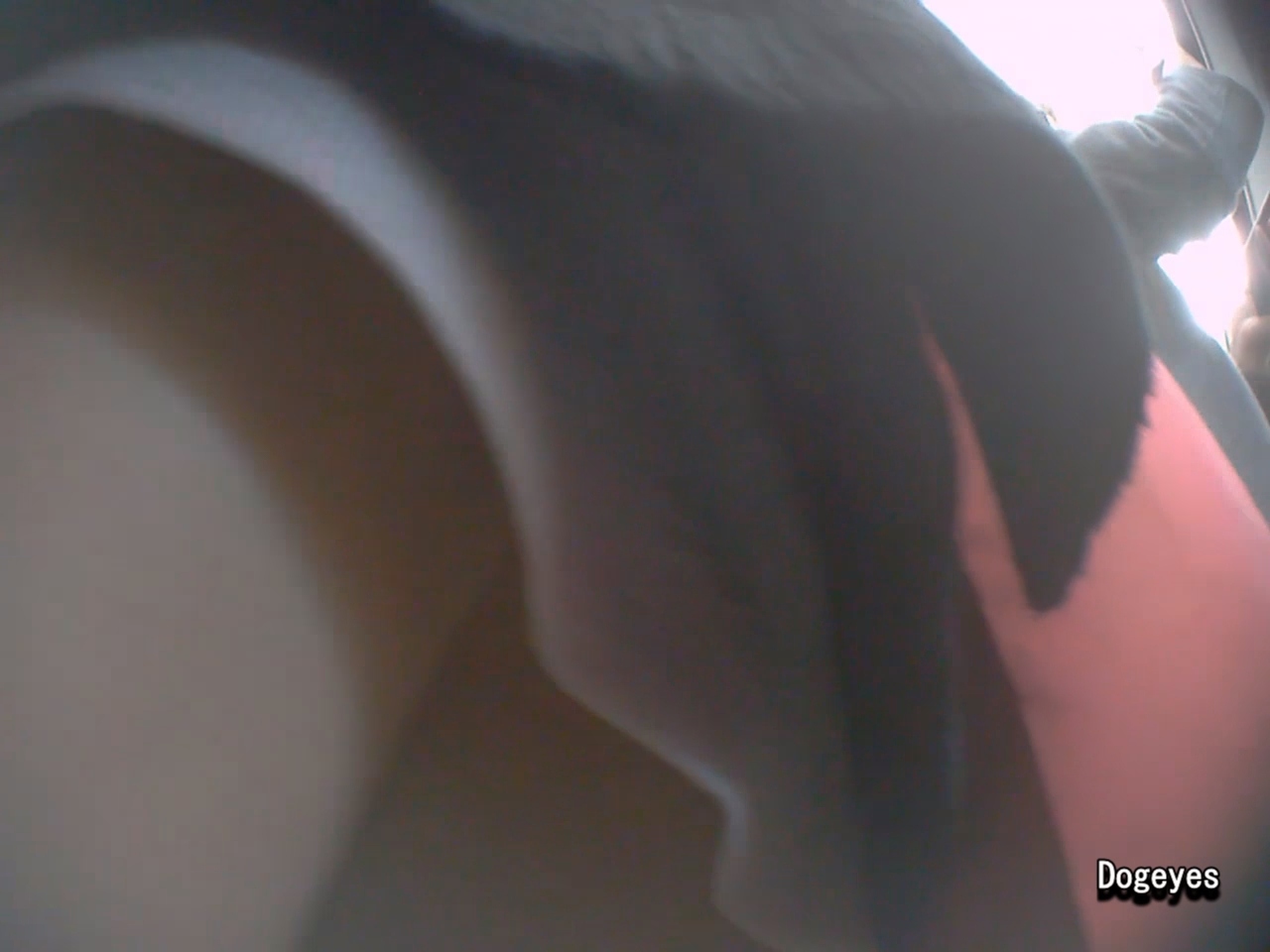 黒のコートの中はニットワンピー、更にその中は、ピンクのTバック膝を曲げ小人になって前下位置からのゲット。Tバックの前位置をどうぞ!可愛いお顔も頂きました。
