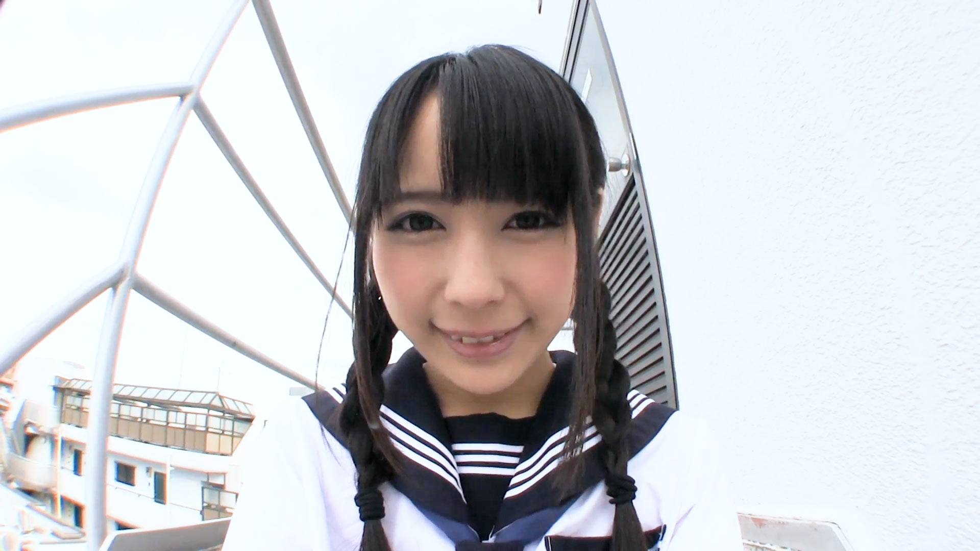 アルバイト先に向かうセーラー×プリーツミニスカに黒髪おさげの清純女子ちゃん。