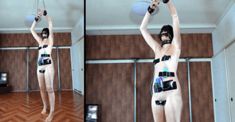 恥ずかしい姿で過ごした後、乳首とクリトリスに装着された玩具で快楽を味わい続ける様子。