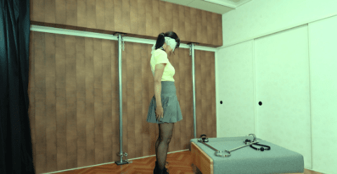 金属の固定具、脚を開きアソコを晒す彼女。