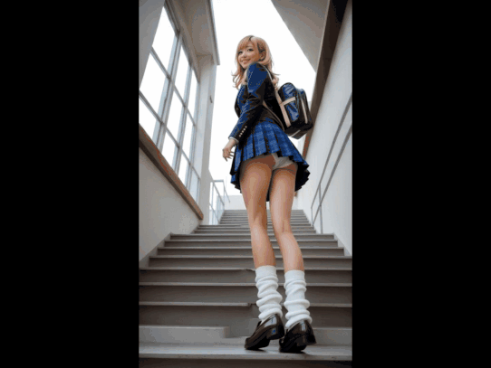 階段の踊り場で振り返ったギャルは、視線に気づいて小悪魔的な笑みを浮かべる。金髪ギャル「そんなに見て…都会じゃ当たり前のスカート丈よ(笑)」
