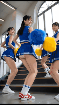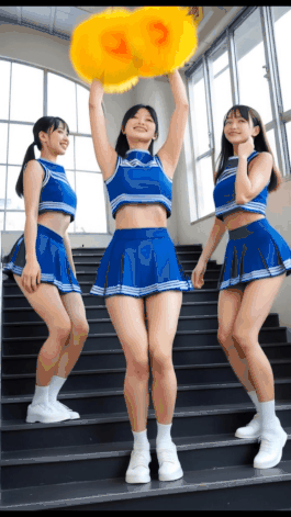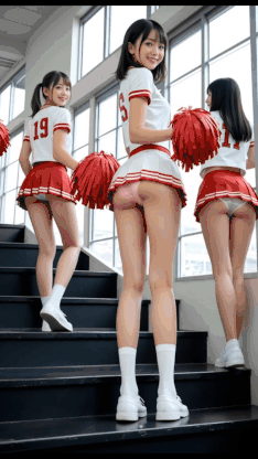 短いチア衣装のスカートの裾が大きく揺れ、パンティーが露わになります。