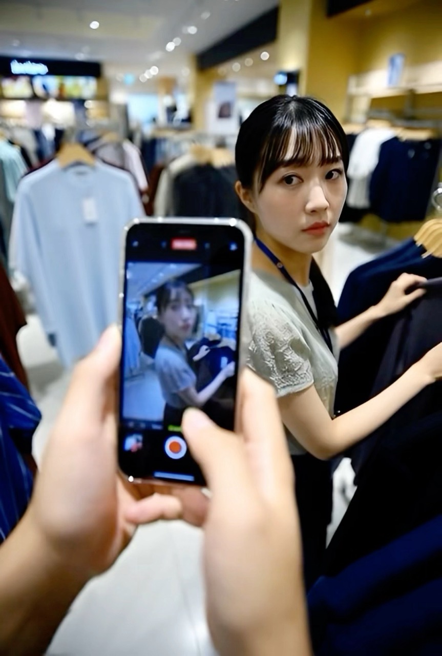 他の店員と話しているシーンから始まります。私はスマホで女性を撮影しながら近づきます。