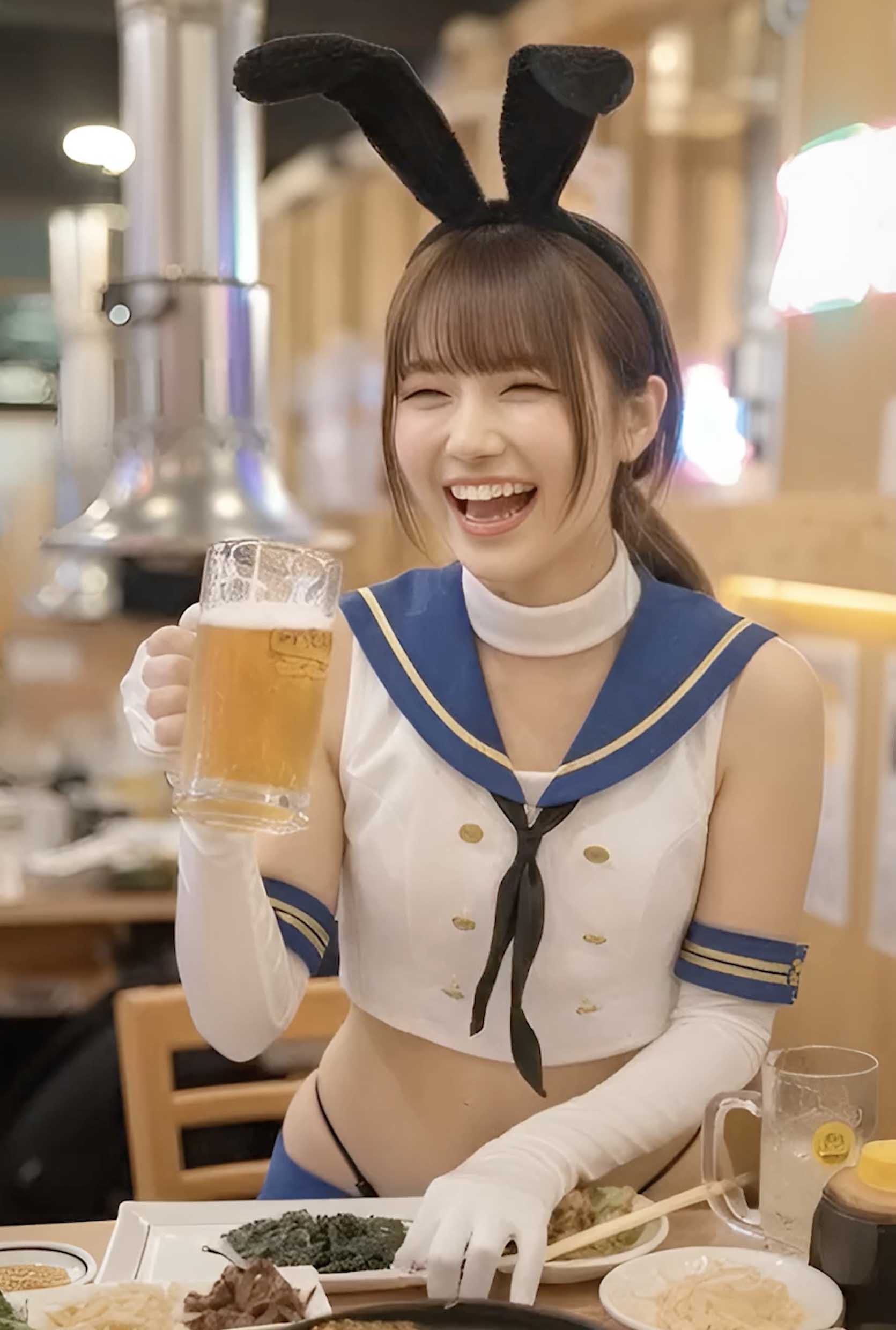テーブル席で彼女と二人きり。島⚫︎のコスに扮し、既に何杯目かの彼女はご機嫌そももの笑。そんな笑顔満載の彼女とまずはジョッキで乾杯から始まります。