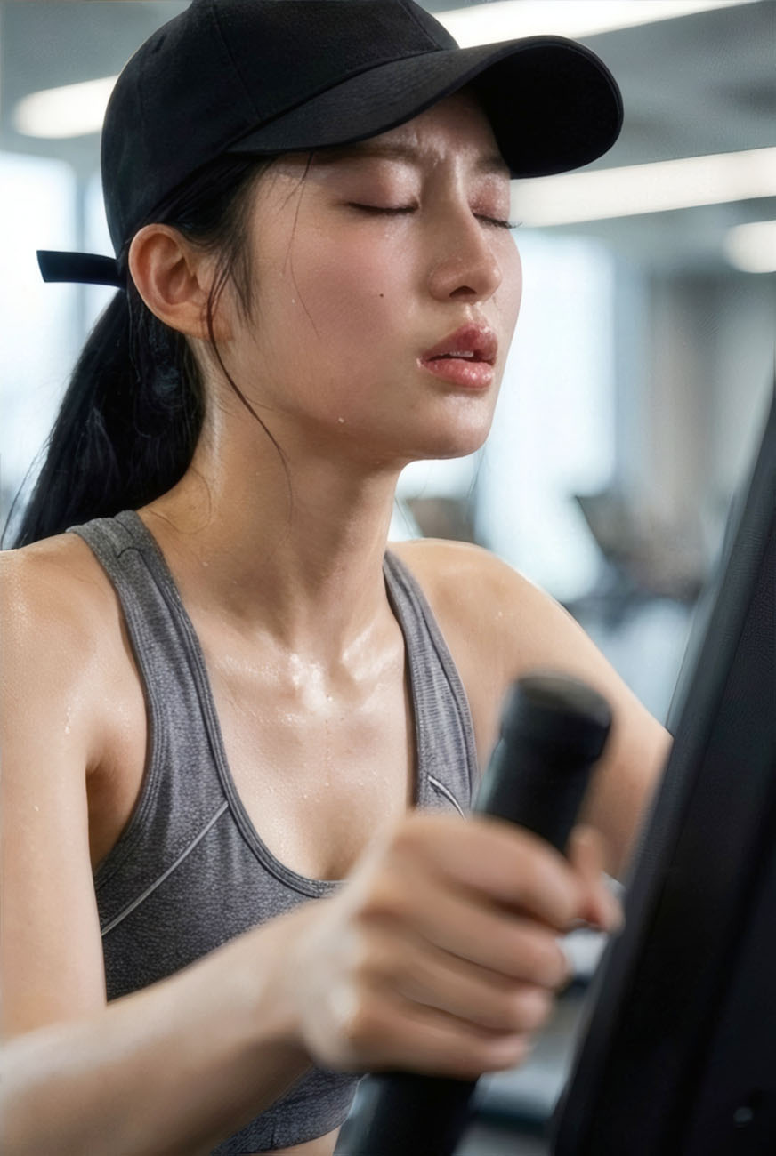 自然光の入る明るいプライベートトレーニングジムで、黒いキャップにグレーのスポーティなジムウェアに身を包み、最新機器を取り揃えたマシンでトレーニングに励むソリョンちゃん。腹筋はシックスパックに割れ、吐く息は湯気のように白く、負荷の過酷さに苦悶に歪める表情。顔から、全身からはその熱気ですでに発汗し全身汗ばんでます。