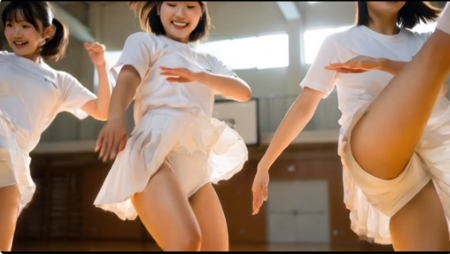 今回の動画は、白いTシャツ、白いスカートを着た成人の女性たちが、体育館で練習を行います。練習中、白いアンスコや乳首が丸見えになります。最初、グループに分かれ、じっくりとストレッチ運動をします。足を開いてストレッチをしているので、白いアンスコが丸見えになっています。途中、服を脱いでストレッチをしている女性もいます。かわいい胸を見せてくれます。